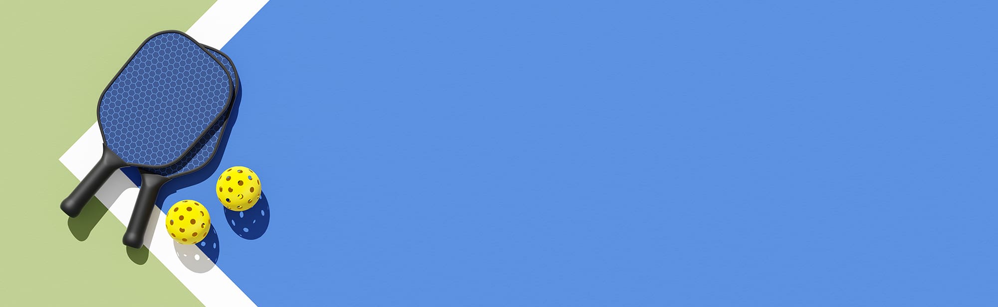 Pickleball paddles and balls on court illuminated sunshine Top view place for text banner 3d illustration render